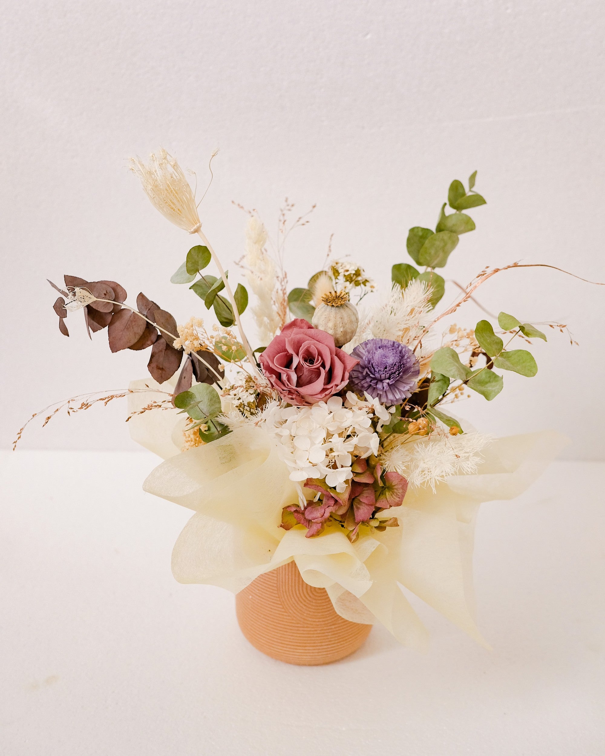 Con la massima raffinatezza, la nostra composizione “Gabriella” porta un assortimento paradisiaco di fiori essiccati e rose eterne che è costruito per durare per molti anni.